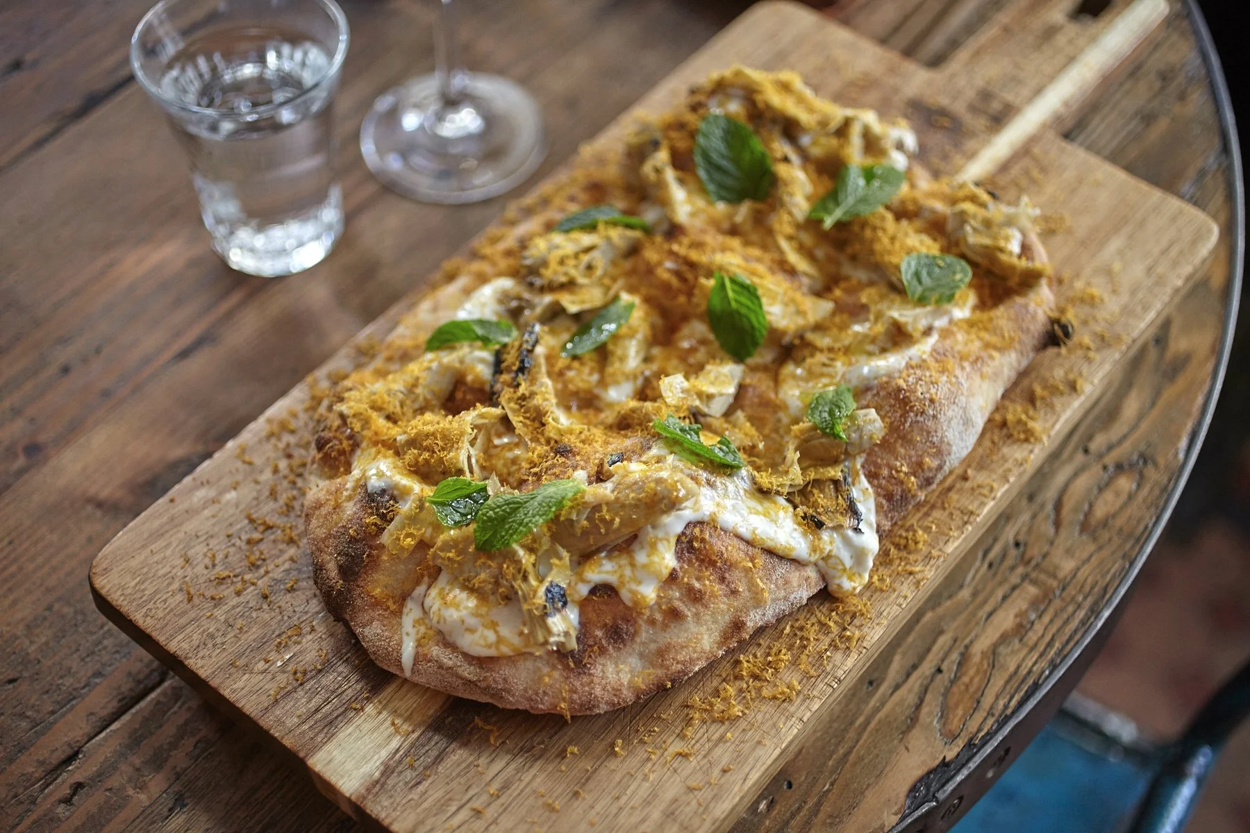 A modern cloud-like pizza, that’s crispy on the outside and soft on the inside. Our dough is made with a blend of soy, rice, and wheat flours sourced from Rome. It then gets a long 72-hour rise and is shaped by hand, helping give pinsas their signature airy interior and crisp exterior textures.